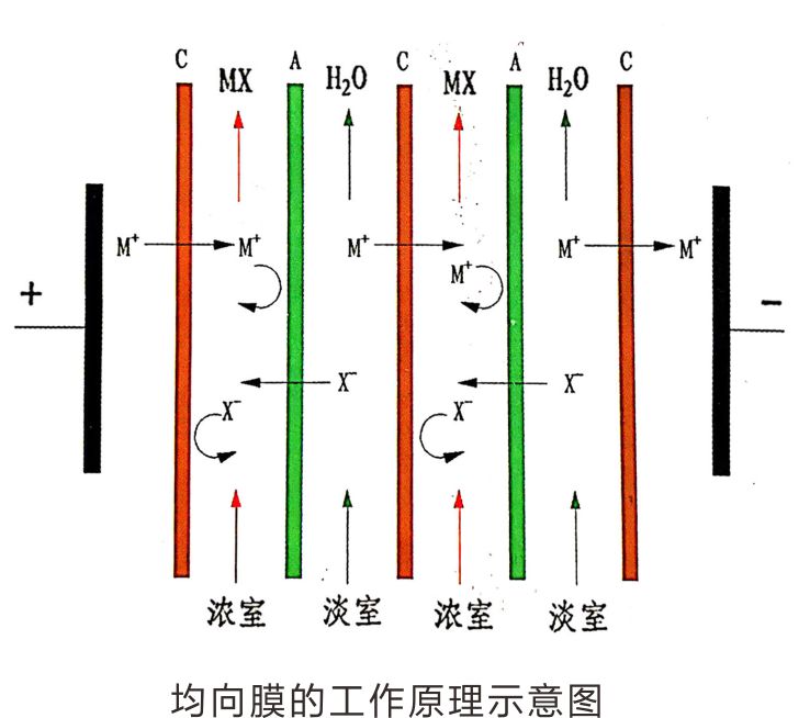 直流電場作用下,當含鹽分的物料流經陰、陽離子交換膜和隔板所構成的隔室時,陽離子穿過陽膜向負極方向運動,陰離子穿過陰膜向正極方向運動,這樣就形成了去除陰陽離子的淡水室和濃縮陰陽離子的濃水室,從而達到物料脫鹽純化或者提高鹽濃度的目的。